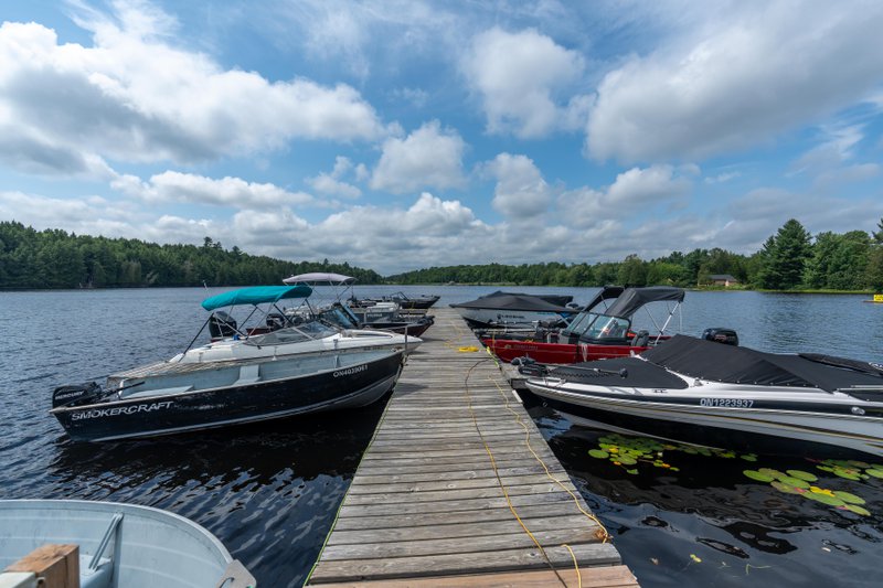 Beyond the cottages, the resort also has a seasonal RV park, with some fully serviced sites available to rent. The marina is a central hub, with 36 boat slips for guests bringing their own boats, along with rentals that include motorboats, canoes, and kayaks. Fuel is available on-site, making it easy to spend a full day out on the lake.